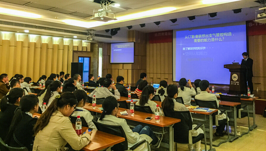 操作演示后,两位教授来到医院学术报告厅开展专题报告。在呼吸科王真主任主持下,水守康之教授讲授了“虚拟支气管软件的有用性及EBUS-GS”,虚拟支气管软件就如同我们开车去陌生地方,需要使用的导航一样,大大提高EBUS-GS的诊断准确性。出云雄大教授讲演“EBUS-TBNA用于纵隔和肺门淋巴结的诊断(支气管内超声弹性成像)”,弹性成像技术刚于2013年10月进入引入市场,在恶性病变检出方面具有较高的敏感性和特异性,为常规EBUS图像提供补充信息,提升EBUS-TBNA的诊断率,减少不必要的活检。