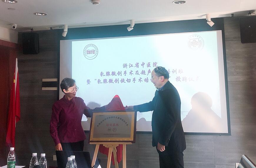 会议期间,鉴于浙江省中医院乳腺科多年的微创手术积累以及在手术规范化方面的探索,中国医师协会乳腺疾病培训专家委员会主任委员蒋宏传教授当场给谢小红教授颁发了“中国医师协会乳腺疾病诊疗标准化及微创旋切手术培训基地”的铭牌,为今后浙江省内尤其是中医院系统内的乳腺微创学习培训提供了更多的学术助力。