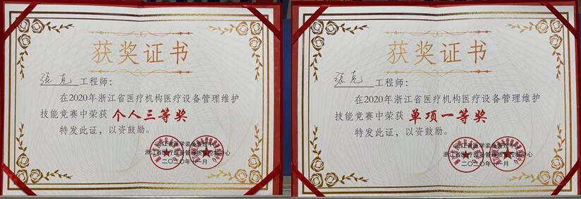 11月28-29日,由浙江省卫健委、浙江省总工会联合举办的“2020年浙江省医疗机构医疗设备管理维护技能竞赛”总决落下帷幕。我院医疗保障部工程师张克同志,喜获个人三等奖和放射类单项奖一等奖。