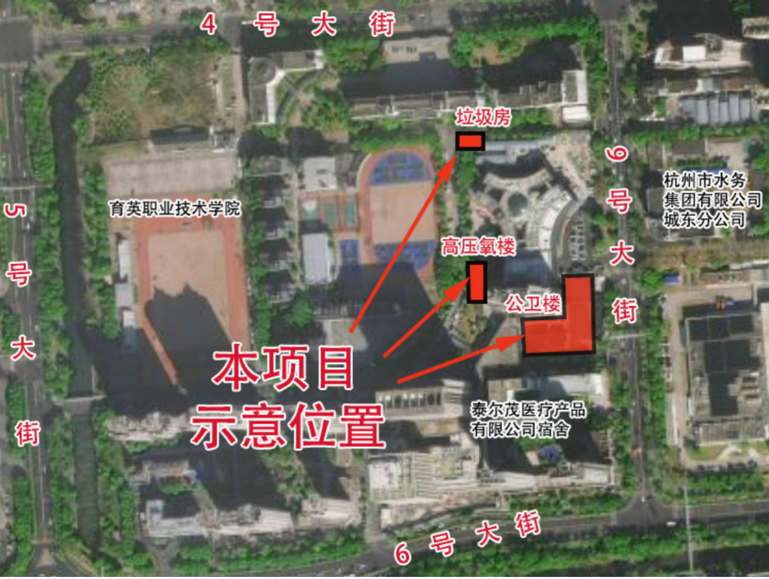 项目建设地点位于杭州市钱塘区9号大街浙江省中医院钱塘院区内现有用地,建设地块西、北侧邻浙江省育英职业技术学院,东、南侧临市政道路9号、6号大街。具体位置如下图所示。