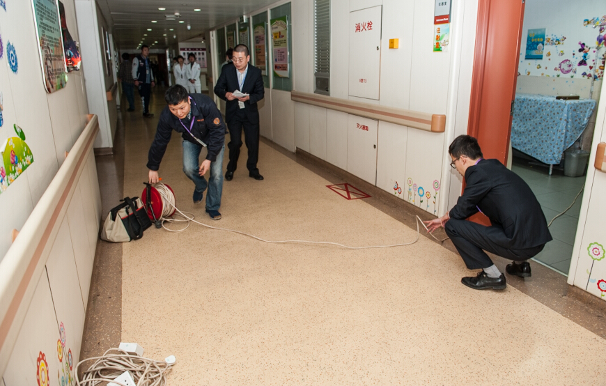 下午2点,演习开始,工程部值班电话(1890)接到十六病区的报修电话,10、11号两个房间插座没电,王翔、张帆接到任务后马上赶到现场,经过检查后发现配电箱内的空气开关外壳烧焦,零线出线螺丝无法紧固。需要更换一只带漏保的空气开关,在更换过程中需要对4~13号房间、医生办公室、实习生休息室等房间进行停电。为此,张帆马上与病区进行了协调工作;王翔则电话通知工程部其他人员带上空气开关、工具及应急接线板配合工作。俞成在接到王翔电话后迅速到库房领岀空气开关,并带上工具及应急接线板赶往事故现象。在张帆和病区护士长的指引下,现场工作人员自动分为两组,用应急接线板分别从护士站引出电源,一路保证医生办公室的正常供电,另一路保证不能断电病房的供电,在医生办公室电脑数据备份好及不能断电病房使用应急接线板电源后,王翔对配电屏做断电处理更换空气开关,张帆在旁做监护,其余两组电工分别对临时供电进行巡视,并对病人进行安抚及解释断电原因,并留意临时线缆对过往行人的影响。在王翔换好空气开关,并经张帆确认无误后恢复供电,经查故障点插座确已有电后对应急接线板供电恢复到各室各自插座供电。至此,半小时的病房插座失电演习活动结束。