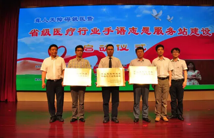 6月17日下午,由省残联、省卫计委、团省委主办的浙江省聋人无障碍就医暨省级医疗行业手语志愿服务站建设启动仪式在杭州举行。我院作为首批建立“聋人无障碍就医志愿服务站”的省级医院,由党委副书记陈智能代表医院,接受了“省级医疗行业手语志愿服务站”铜牌。