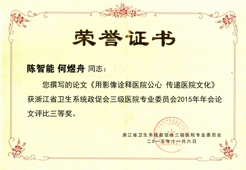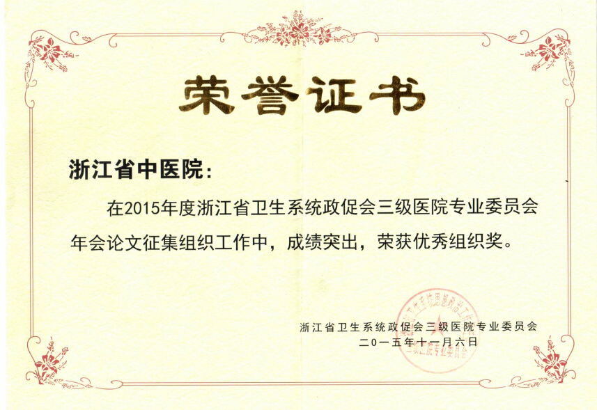 大会表彰了年会优秀论文组织单位和个人,我院被授予浙江省卫生系统政促会三级医院专业委员会2015年会论文优秀组织奖,并荣获优秀论文三等奖1项。