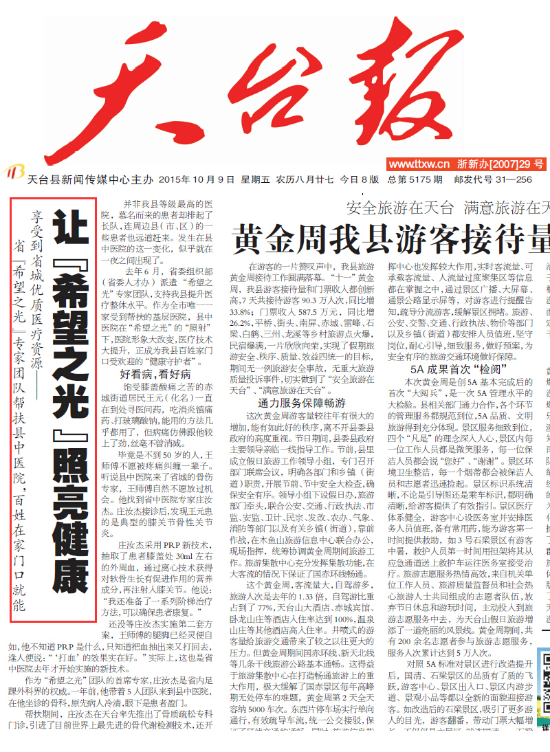 本报讯 (徐平张主俐) 一年前,“希望之光”团队首席专家庄汝杰带着5人团队入驻天台县中医院,在他坐诊的骨科,以前病人冷清。眼下,却是患者盈门,天台县中医院骨科门诊室外排起了长队,患者除了本地还有来自周边县市。