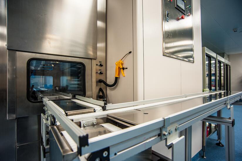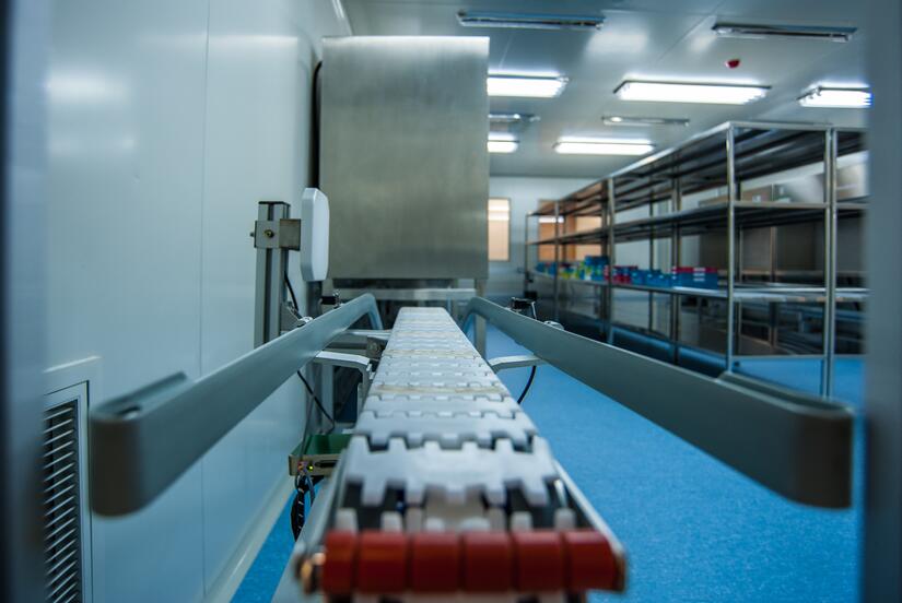 轨道传输是在制药工厂GMP车间广泛采用的一种物流传输工具,也是首次使用在了PIVAS的冲配间中,轨道将冲配的各个流程有机连通起来,减轻人力投入,减少交叉传递带来的污染。轨道传输线主要包括:自动传输窗、射频管理系统、分拣系统、PFID射频管理系统等部分,于PIVAS药品配置的排药、核对、进仓、暂存、配置、退药、出仓、发放等每一环节自动采集医嘱的信息,实现药品配置过程中每一环节的追踪追溯功能。