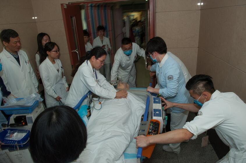 “病人”转眼就到,经过快速的预检分诊后,“病人”送往了抢救室,医生护士各司其职:吸氧、监护,开通静脉通路,体检、常规心电图检查……在大家熟练的操作中,各项工作在15分钟之内完成。眼看“病人”转危为安,大家松了一口气,考官却突然发难:病人的病情恶化!医生护士毫不畏惧,呼叫会诊,插管,用药……依旧有条不紊的进行着。