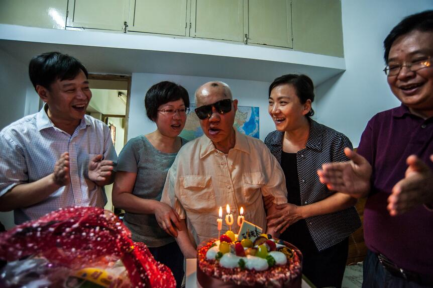 岁月犹如无情的尖刀,在王老额上刻下了深深的痕迹,也刮去了他许多曾经的记忆。当谈到后脑勺的那个伤疤时,老人说,那时战争太频繁,每天不是在跟敌人打仗,就是在行军的路上,受点伤甚至牺牲都是很平常的事情。老人风轻云淡地描绘着九死一生的场景,仿佛那时的一切都很平常。我们不敢过多的询问和打扰他,惟愿老人健康、平安。这位耄耋老人,数年征战沙场,历经战争的残酷。1946年,在山东的一场战斗中,王老被敌人的冷枪打伤,子弹进入右太阳穴穿过鼻梁从左眼出来,从此双目先后失明。
