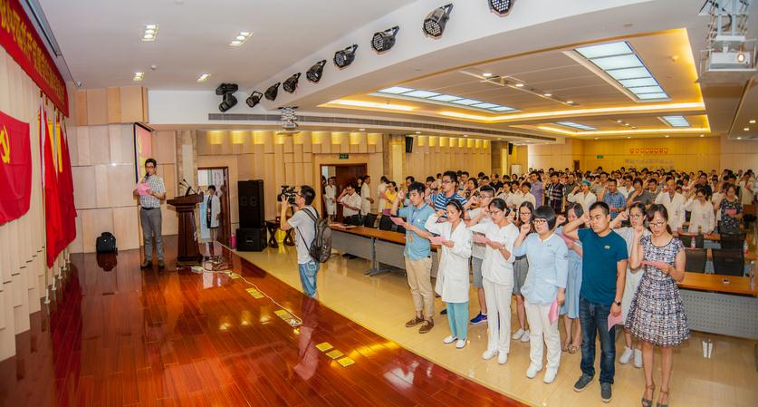 会上,医院党委副书记、纪委书记陈智能带领10名新党员在党旗下庄严宣誓。同时,在场的全体党员重温入党誓词。孙磊同志作为新党员代表发言,表明了践行入党誓言的决心。