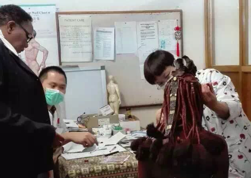 她们两位自诉头痛,腰背疼痛。我先给她们测量血压,均是正常范围。由于头发上涂着厚厚的红泥,头顶上还系着动物毛皮制成的发冠,我们就试着用清凉油给予穴位按摩印堂、两侧太阳穴,点涂人中穴……细思千里之外的红泥人为何愿意选择相信我们中国医疗队,笔者认为与我们中医特色的医疗优势有关,因为我们中医通过望闻问切进行诊断治疗,不需如西医般依赖实验室结果,而来自于遥远贫穷的红泥人在温都举目无亲,亟需快速有效地解决问题,因而从国内带来的风油精、红花油、板蓝根、妇科千金片、双黄连等效验成药大有用武之地,加之她们部落较为聚集,疗效口口相传,于是中国医疗队诊室成了仅剩五万族群红泥人的问诊地。