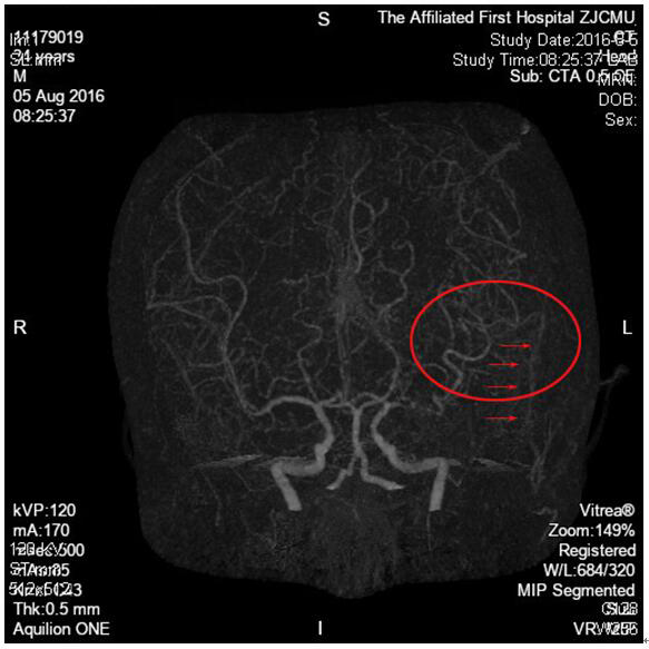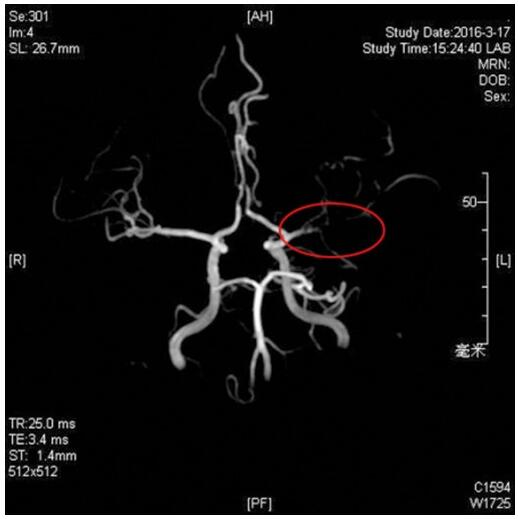 术前磁共振血管成像:左侧大脑中动脉闭塞。