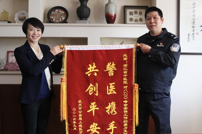 12月12日上午,上城区公安分局反恐副大队长王益民和湖滨派出所所长沈宁专程来我院赠送锦旗并颁发奖章,对我院在G20峰会期间的维稳安保工作表示感谢和慰问。医院副院长祝亚男代表医院接受了锦旗和奖章。