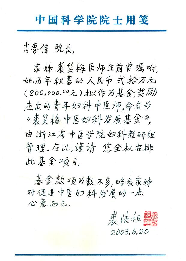 浙江省中医院的工作人员近日在整理资料时,意外发现了这封裘法祖院士的亲笔信,信中内容说的是他姐姐裘笑梅的临终医院,用她历年积蓄的20万元人民币设立“裘笑梅中医妇科发展基金”,奖励杰出的青年妇科中医师,以促进中医妇科的发展。