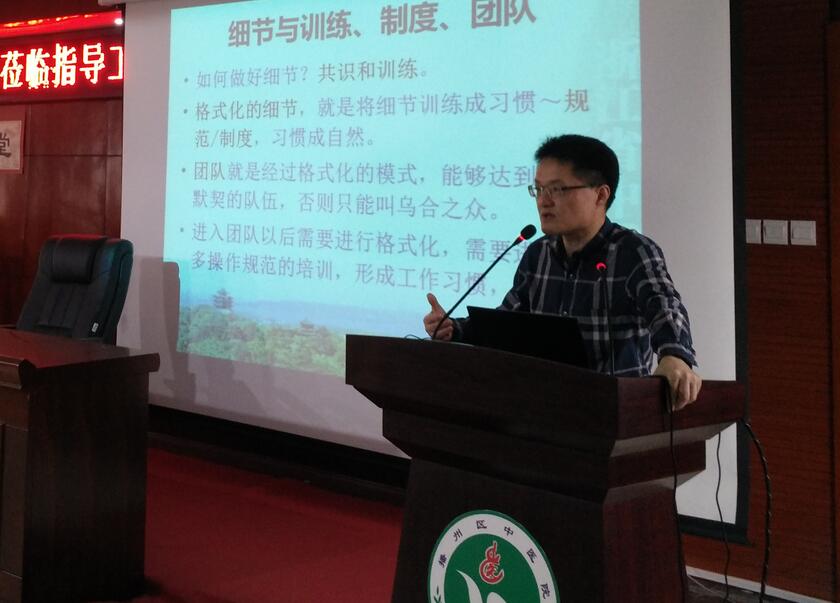 简短的座谈后,毛威给播州区中医院的全体中层干部作了题为《细节、团队、大医——兼谈医疗安全管控》的医院管理专题讲座。讲座中,毛威结合课件和大量案例的对比,深入浅出地将管理理论简单化、枯燥的内容生动化,将医疗安全管控的理念融入到大家的思想当中。医疗专家团的黄小民、侯群、黄宣、吕昕、吴巧敏、胡敏勇等专家则同时在医院门诊一楼开展义诊咨询活动,虽然当天还下着细雨,但仍阻挡不了当地百姓求医的热情,在每个义诊科室门口都排起了长长的队伍。