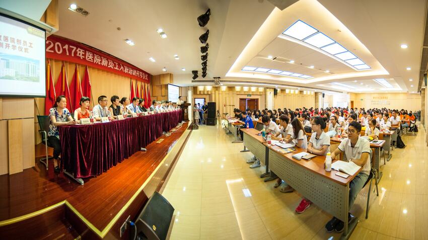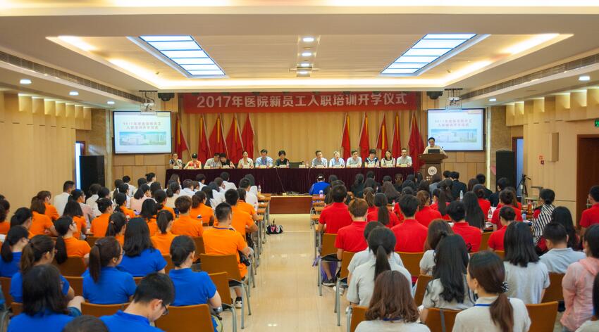 7月31日,2017年度医院新员工入职培训开学典礼在学术报告厅举行,医院院长毛威、党委书记黄琦率党政班子全体成员出席与130余位新员工亲切见面。
