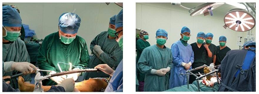 37岁的蒋先生因车祸导致右胫腓骨上段开放性骨折、右胫骨平台粉碎性骨折、右股骨干开放性骨折、右小腿软组织挫裂伤在浙江省中医院下沙院区住院治疗,10月4日上午,他幸运地成为了杭州市首位接受胫骨平台骨折错位和关节面塌陷微创手术治疗的患者。浙江省中医院骨伤科专家团队在中华医学会骨科学分会第十一届委员会主任委员、河北医科大学第三医院院长张英泽教授的示范指导下,用双反牵引技术顺利为蒋先生实施了微创手术下的股骨、胫骨平台复位固定。使得既往至少需要4小时、数块钢板,以及多条大切口的复杂手术,只用了1枚髓内钉、2块钢板便成功完成,手术创口还不到5公分。