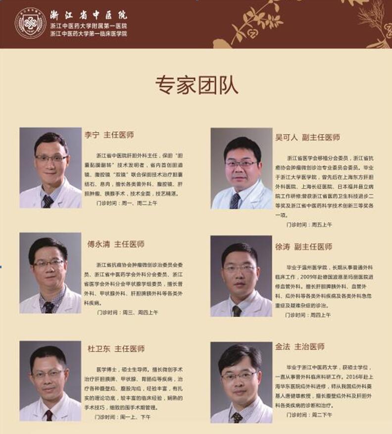 浙江省中医院肝胆外科是技术实力雄厚的肝胆胰脾外科诊疗中心。医院在1993年从美国引进整套腹腔镜设备并成功开展腹腔镜下胆囊切除术,同时一大批新技术先后开展,肝囊肿开创引流术、胆总管切开取石、腹腔镜脾脏切除等手术均取得良好疗效,迄今为止已成功开展各种腹腔镜手术逾万例。将内镜、胆道镜、腹腔镜等三镜联合应用,最大限度地发挥各自优势,同时开展肝癌的各种肝叶、肝段切除、肝门部胆管癌及胰腺癌根治等复杂手术,标志着科室先进的综合水平。在学科带头人李宁主任的带领下,保胆取石(息肉)手术具有鲜明特色优势,在国内外首创“胆囊黏膜翻转”技术,术后结石复发率降至4%,并经过多年努力,形成“省中保胆标准”,得到同行专家高度认可。