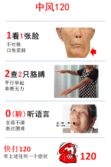 省中医院神经内科王珏副主任中医师介绍,卒中是目前导致人类死亡的第二原因,与恶性肿瘤、缺血性心脏病构成多数国家的三大致死疾病。它包括缺血性卒中和出血性卒中,其中以前者最常见,约占70%-80%。缺血性卒中原因有很多,主要危险因素有高血压、高血脂、房颤、糖尿病、长期口服避孕药等(本文中的黄大爷即有多年的房颤病史)。临床表现也是多种多样,但是大家只要记住“中风120”这个口诀,就能大体判断出多数的卒中: