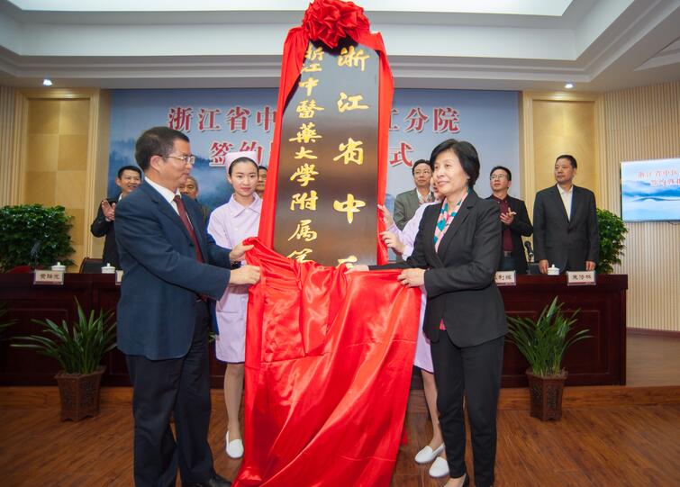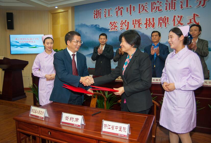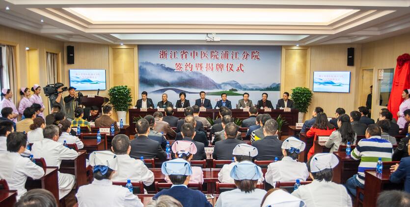 11月16日,我院与浦江县人民政府签订医疗卫生战略合作协议,重点托管浦江县中医院,该院正式成为我院新的托管分院。浙江省卫生计生委副主任王国敬,浙江省中医药大学副校长张光霁,浙江省中医药管理局副局长蔡利辉,浙江省中医院党委书记黄琦,金华市卫生计生委副主任朱修林,浦江县领导施振强、黄瑞光及各相关单位负责人,我院合作交流办公室、医务部负责人及专家等出席签约暨揭牌仪式。浦江县副县长张卫东主持签约暨揭牌仪式。