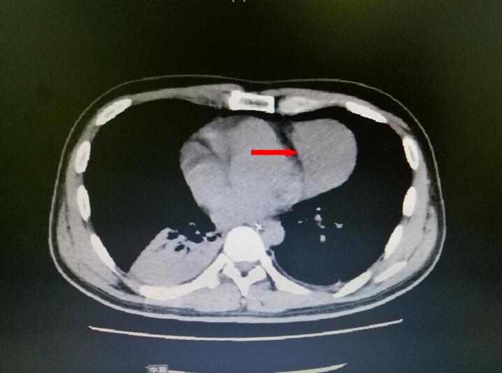 ICU的医疗卫士们详细诊察患者,抽丝剥茧分析病情,发现导致重症肌无力的“根源”——巨大胸腺瘤(见下图箭头处)。而患者肺部氧合情况极差是由于肺部痰液阻塞导致。