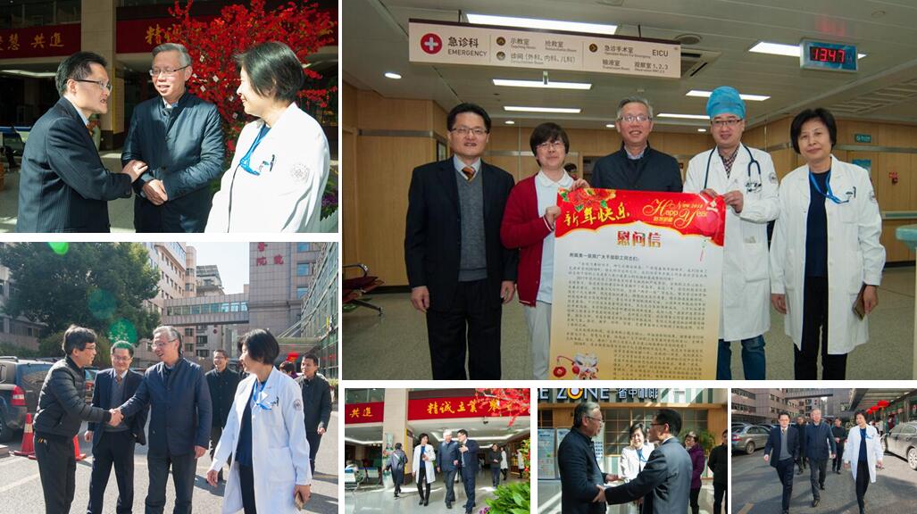 在医院急诊室,包保根副主任一行、方剑乔校长一行看望了正在忙碌的医务人员,并与大家亲切交谈,送上慰问信和新春祝福。领导们关切地询问急诊室的节日门诊和护理服务内容,感谢医务人员一年的辛苦付出,并对医护人员的身心健康表示关心。