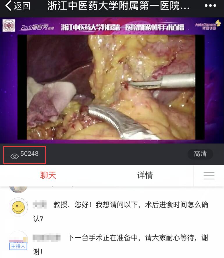本次直播的三个术式是当今我国胃癌外科领域最常用的经典术式。分别是全腹腔镜胃癌根治(全胃切除+overlap吻合)、开腹胃癌根治(远端胃大部切除+肝十二指肠韧带、胰头后淋巴结清扫)、全腹腔镜胃癌根治(远端胃大部切除+毕Ⅱ式吻合)。手术中,程向东的从容和自信,手术技巧和人格魅力获得了全国各地“粉丝”们的点赞。在手术期间,根据在线观众的问题,程向东还一一做了解答,例如术前肠道的准备、胃管的放置、术中站位、结肠肝区的清扫、腔镜和开腹手术能量设备的选择等等。为大家解除了很多心中的困惑。截止11时,在线观看人数已突破3万。