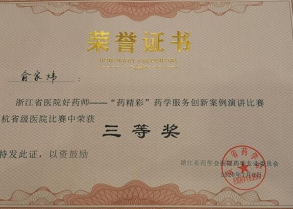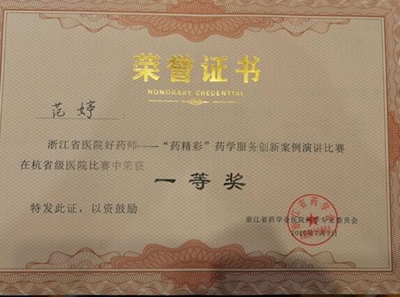 7月3日,由浙江省药学会医院药学专业委员会联合浙江省医师协会临床药师专家委员会、浙江省医院药事管理质控中心举办的在杭省级医院好药师——药精彩”药学创新服务案例演讲比赛顺利召开,经过激烈角逐,我院药剂科范婷药师、俞佳炜药师脱颖而出,分别获得一等奖和三等奖。