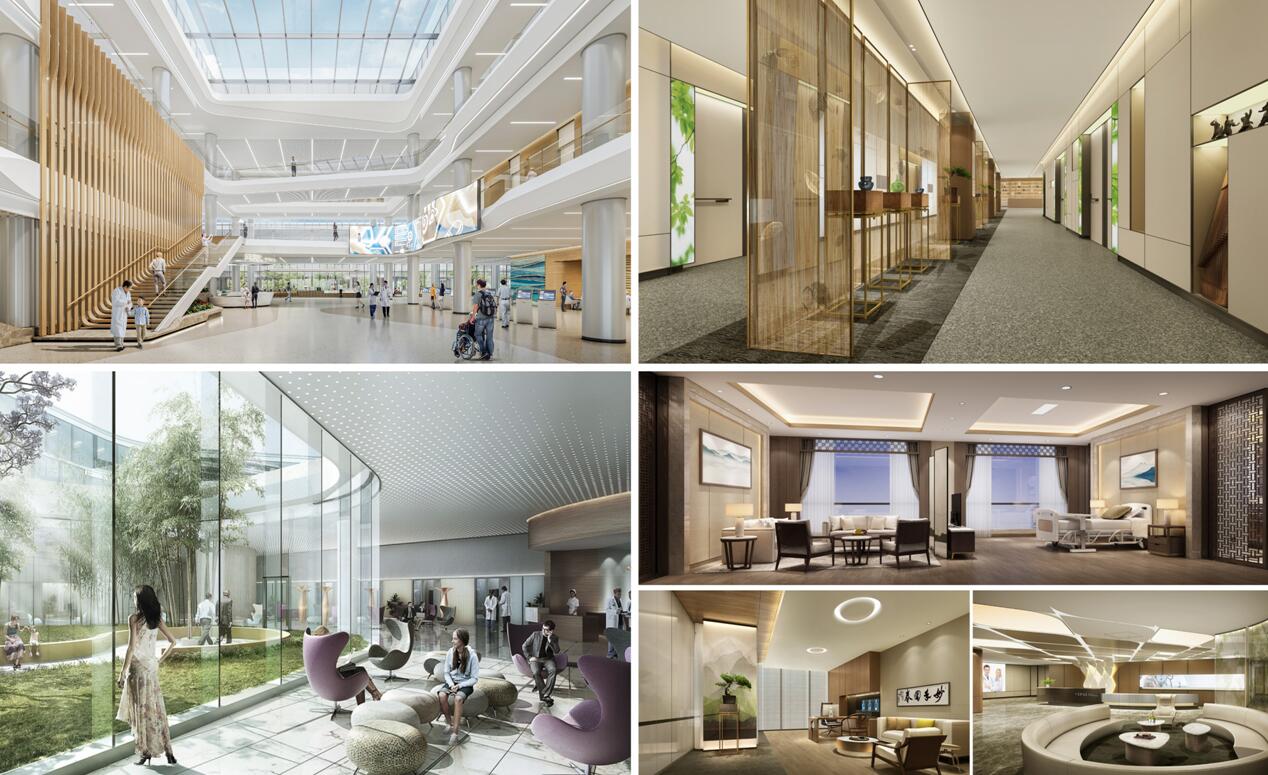 富阳新院区对标国际顶级医院规划建设理念,建筑布局展示出厚重、简洁、大方、功能优先的空间形态,与医疗建筑寻求人文关怀之间形成共鸣,契合中医文化所传承的“医者仁心”“天人合一”“大医精诚”的思想。同时,与医院其他院区建筑风格相呼应,充分体现医院悠久的历史传承与创新。