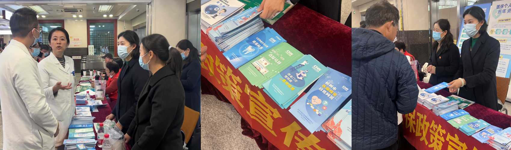 陶主任携手医院副院长金娟,医院医保办公室主任谢俊明等相关工作人员在门诊一楼进行了场地布置,桌面上放置了各种政策宣传手册,前来咨询了解的患者络绎不绝。