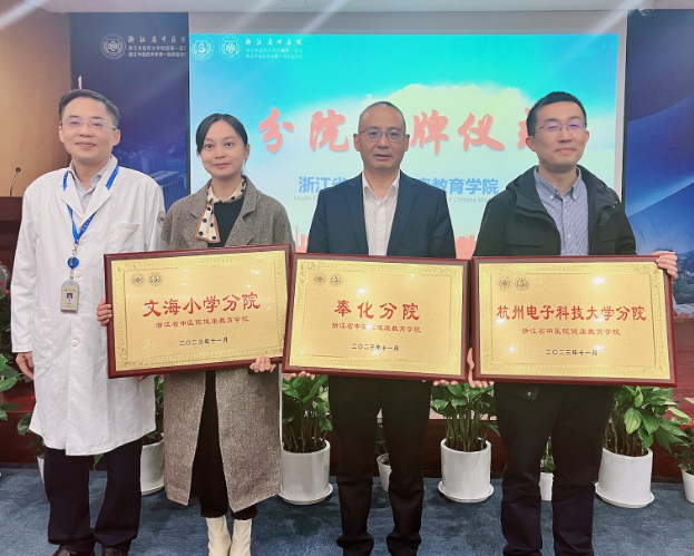 11月23日下午,我院健康教育学院分院授牌仪式在钱塘院区举行。本次新增三家分院,分别是杭州电子科技大学分院、奉化分院及文海小学分院。杭州电子科技大学公共事务管理处处长林浩、杭州电子科技大学校医院院长兼公共事务管理处副处长周杭,宁波市奉化区中医医院党委书记周耀,浙江省名中医研究院副院长、宁波市奉化区中医医院执行院长张丽萍,文海小学副校长马环作为分院代表参加了授牌仪式。浙江省中医院副院长、健康教育学院副院长黄抒伟为分院授牌。