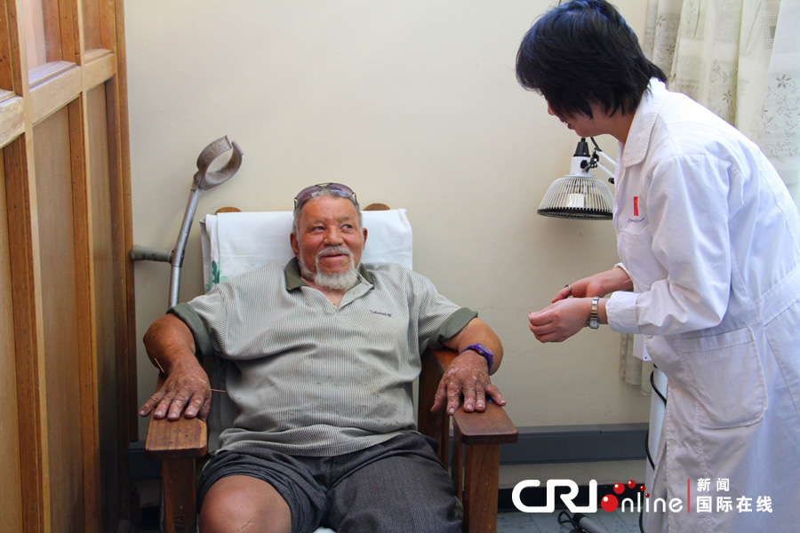 76岁的普莱西斯老人定期接受中国医生的针灸治疗,关节疾痛逐渐得到缓解