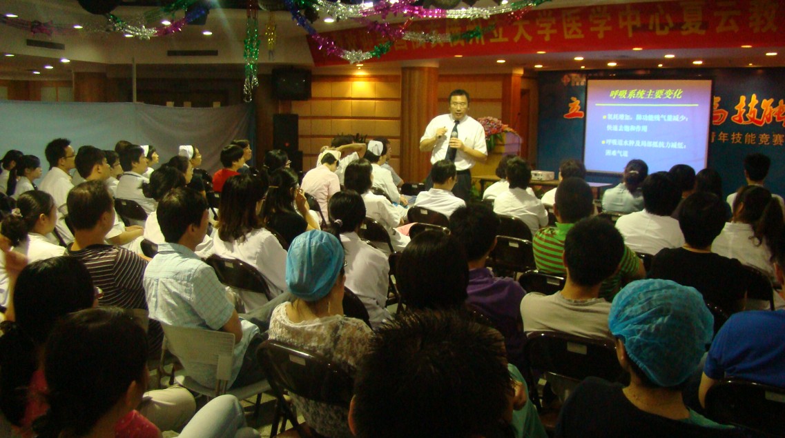 随后,夏云教授为2010级和2011级的住院医师进行了培训。培训中,夏云教授为我院60多名住院医师介绍了美国特别是俄亥俄州立大学医学中心的住院医师培训情况,与大家分享了自己作为住院医师先后在多个世界医学名校学习期间的难忘经历和从中所获得的经验与感悟。并把一首诗“浙海江深波浪流,心思恚想怨悲愁。客官宵定寒窗宿,达道逍遥远近游”送给全体学员,鼓励大家刻苦学习,努力成就一番作为。