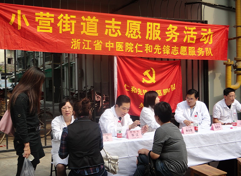 9月23日下午,小营街道社区卫生服务中心门口,人头攒动,众人都围在浙江省中医院外二支部义诊团队前。2011年6月,浙江省中医院外二支部与小营街道社区卫生服务中心签署了“大手牵小手”服务协议,定期组织专家到社区开展义诊和健康讲座。这是外二支部的医护人员第二次走进小营街道,在三个多小时的义诊中,专家们耐心地倾听病人主诉,专业地作出诊断和指导,并免费为病人测量血压,作健康指导。