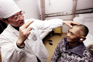 昨天,在浙江省中医院耳鼻喉科病房里,赵荣祥主任为范大爷揭开纱布换药,