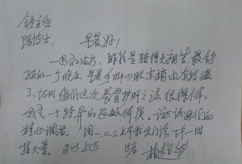 住院后十多天,柏老偷偷递给陈群伟一封手写感谢信:“谢谢你们的精心调治,周一、二、三上午我出门诊,周一下午准时输液。”在记者面前,陈群伟掏出这封字句之间流露真情的信,几度哽咽。