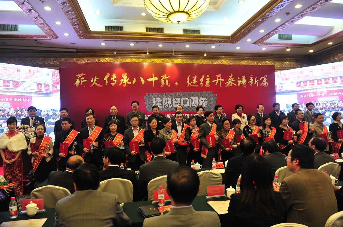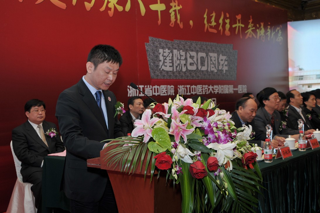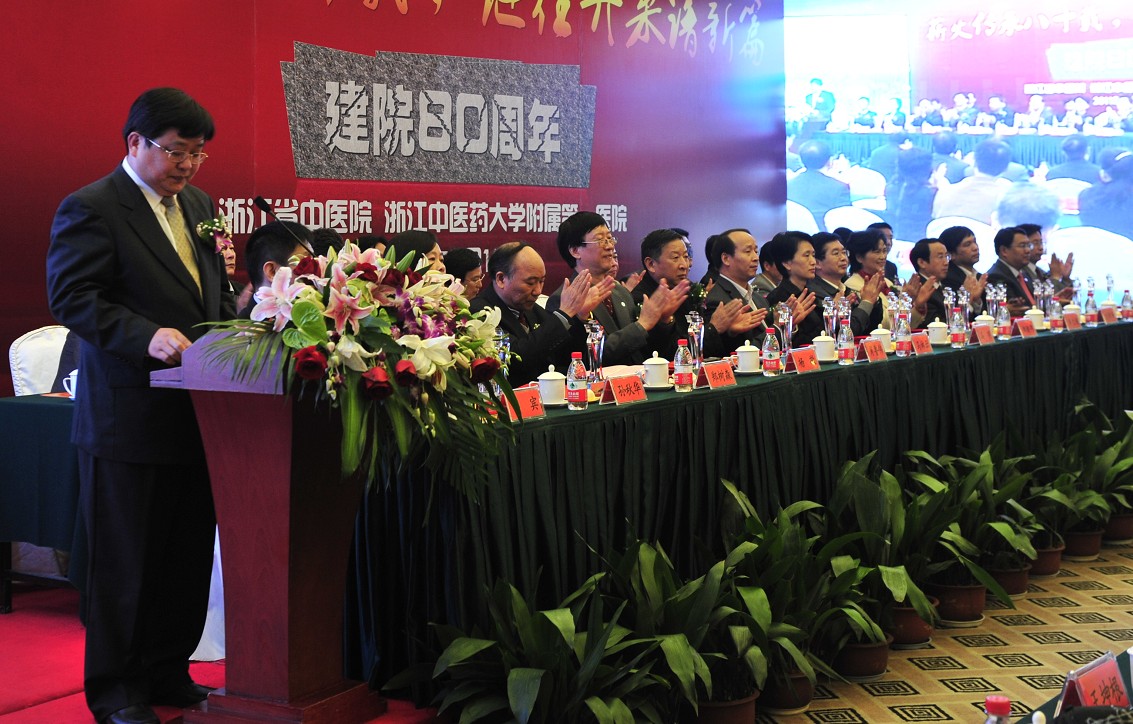 大学附属第一医院)在新侨饭店桂宫隆重举行了建院八十周年庆典。省委书记、省人大常委会主任赵洪祝、卫生部部长陈竺等发来贺信。省人大常委会副主任冯明、省政府副省长郑继伟,省政府副秘书长马林云,省人大常委会科教文卫副主任肖鲁伟,浙江省教育厅厅长刘希平,省卫生厅厅长杨敬,浙江中医药大学党委书记孙秋华,校长范永升等领导等出席了庆典。省、市、区有关部门的领导,浙江中医药大学党政班子领导以及省内外兄弟单位、对口支援单位嘉宾、国际友人和本院干部职工代表近500人参加了庆典活动。庆典上,省卫生厅厅长杨敬指出,浙江省中医院前身——浙江省立医院是我省最早的省级公立医院,八十年来以“精诚、仁和”为院训,秉持“融汇中西医学,贯通传统现代”的办院理念,身体力行地实践着“大医精诚”的医学精神,为我省卫生事业的发展,为广大人民群众的身体健康作出了卓越的贡献。如今正值我省深化医药卫生体制改革关键阶段,卫生事业进入“十二五”发展的新时期。希望我院以此为契机,全身心地投入到深化医药卫生体制改革中,传承仁心仁术、济世救人的精神,担负起发扬中医药文化,提高中医药水平,提升中医药服务能力的