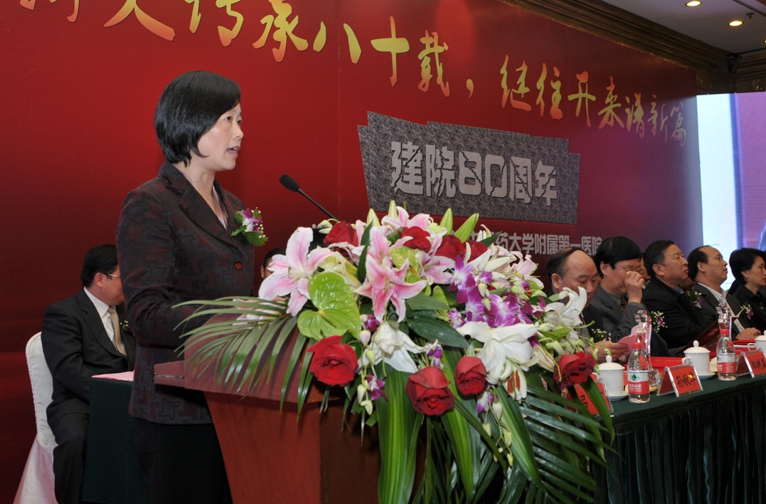浙江中医药大学党委书记孙秋华向长期以来关心支持学校附属医院建设与发展的各级领导和社会各界朋友表示了崇高的敬意和衷心的感谢!她指出医院80年辉煌成就的取得,是各级政府悉心关怀和大力支持的结果,也是医院历任领导班子团结奋进和广大干部职工共同努力的结果。院庆是对80年辉煌成就的一次展示,是医院科学发展的里程碑,更是医院再铸辉煌的誓师会,希望医院以80年院庆为新起点,大力弘扬“求本远志”校训和“精诚仁和”院训精神,努力谱写医院发展新篇章。希望医院在国家医药卫生体制改革和中长期教育改革和发展规划纲要实施中扎实推进医院“十二五”发展规划,力争各项事业再上一个新台阶,为中医药事业和人民健康做出新贡献。希望医院领导班子和全体干部职工以此为契机,解放思想,明确目标,珍惜机遇,勇于开拓,牢记使命,再创辉煌。