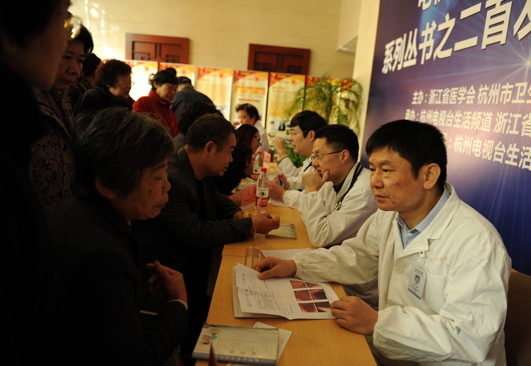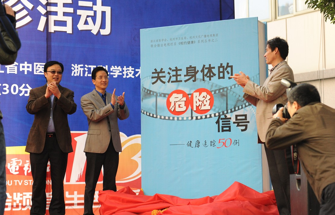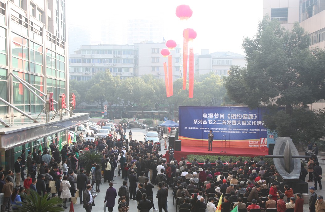 11月28日上午,杭州电视台《相约健康》栏目系列丛书之二首发仪式暨大型义诊活动在我院隆重举行。浙江省新闻出版局副局长陈克韶、杭州市卫生局局长陈卫强、浙江出版联合集团副总裁骆丹、杭州市文化广播电视集团副总经理吴文平、浙江省医学会秘书长骆华伟、浙江科技出版社社长吴明华、浙江省科技协会科普部部长戴力、杭州电视台综合生活频道总监於敏、我院院长吕宾,以及省人民医院、浙医一院、浙医二院、省妇保、省儿保、省口腔医院、省肿瘤医院、温州医学院附属眼视光一院、解放军第117医院和杭州市级各大医院领导及专家近百人出席了活动。