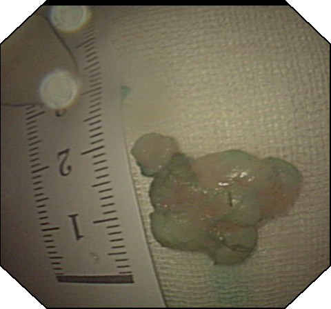 图3 钛夹关闭隧道口 图4 取出的瘤体