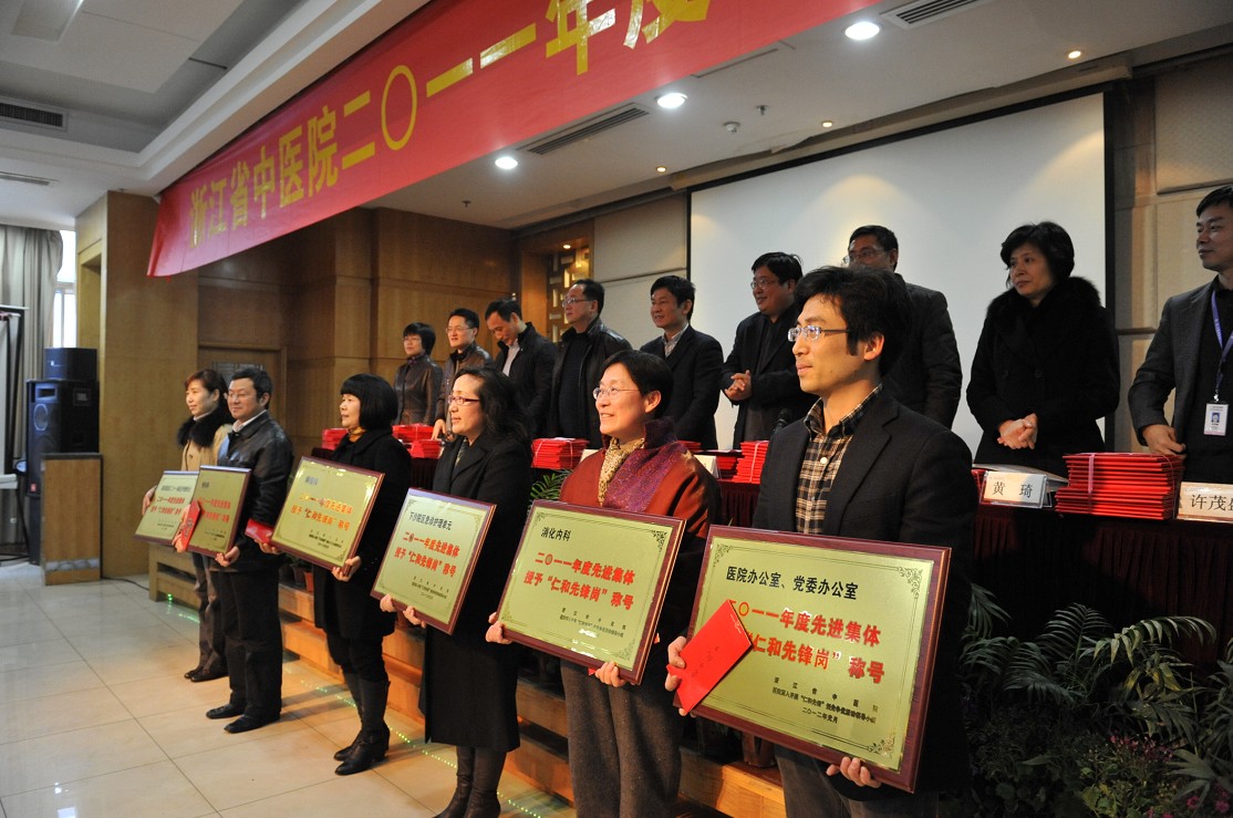 大会上表彰了2011年度医院先进集体和各类先进个人。其中消化内科、骨伤科、病理科、医院办公室 党委办公室、湖滨院区二十一病区护理单元、下沙院区急诊护理单元被评为“二○一一年度先进集体”,并被授予“仁和先锋岗”称号,丁佳利等60位同志荣获“先进工作者”荣誉称号,丁浏江等55位同志荣获“红十字会先进会员”荣誉称号。大会还公布了各类科技成果奖、医学发展奖、教研室和教师评估奖项等。