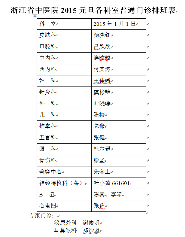 2015元旦各科室普通门诊排班表