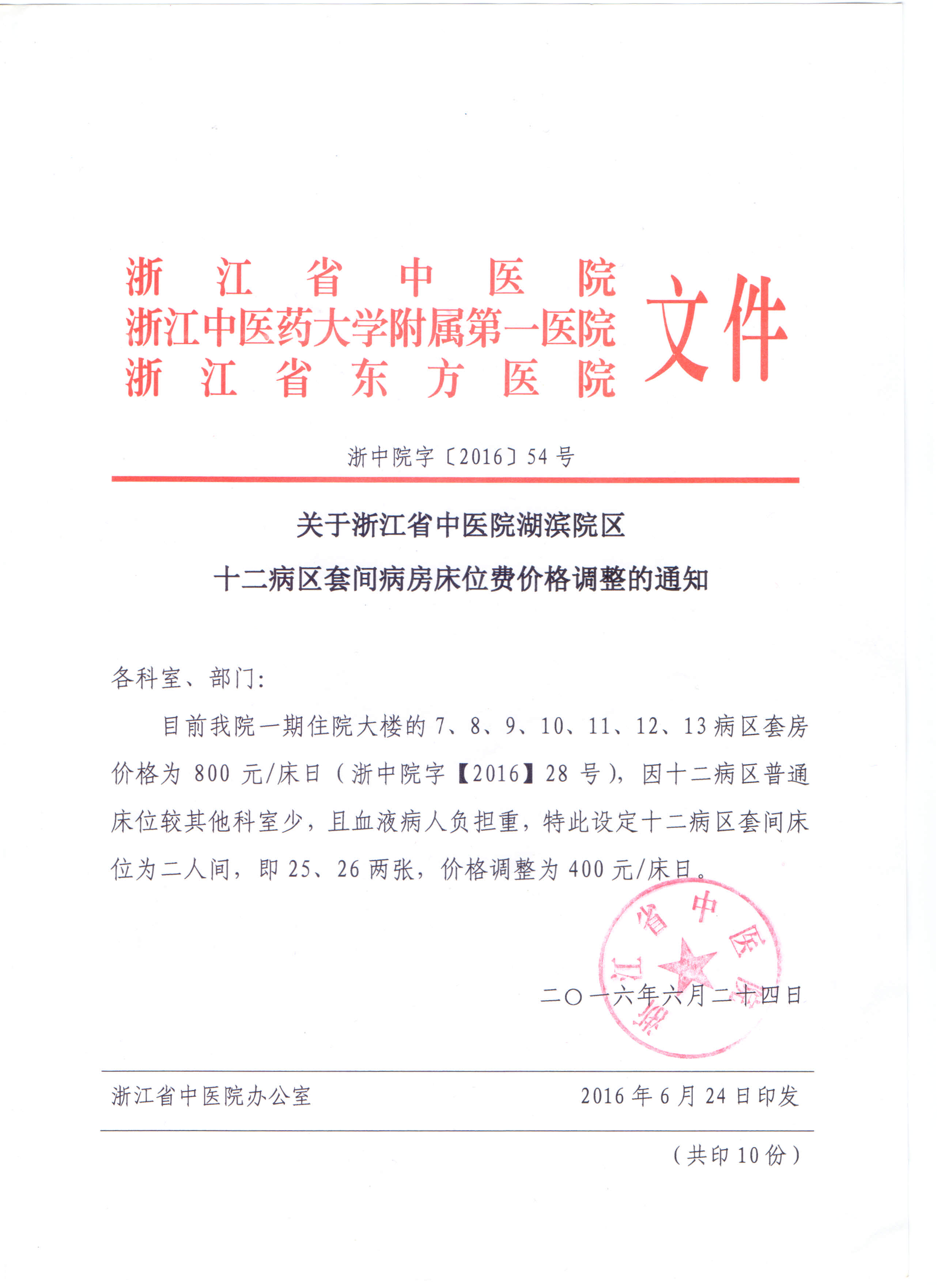关于浙江省中医院湖滨院区十二病区套间病床床位费价格调整的通知