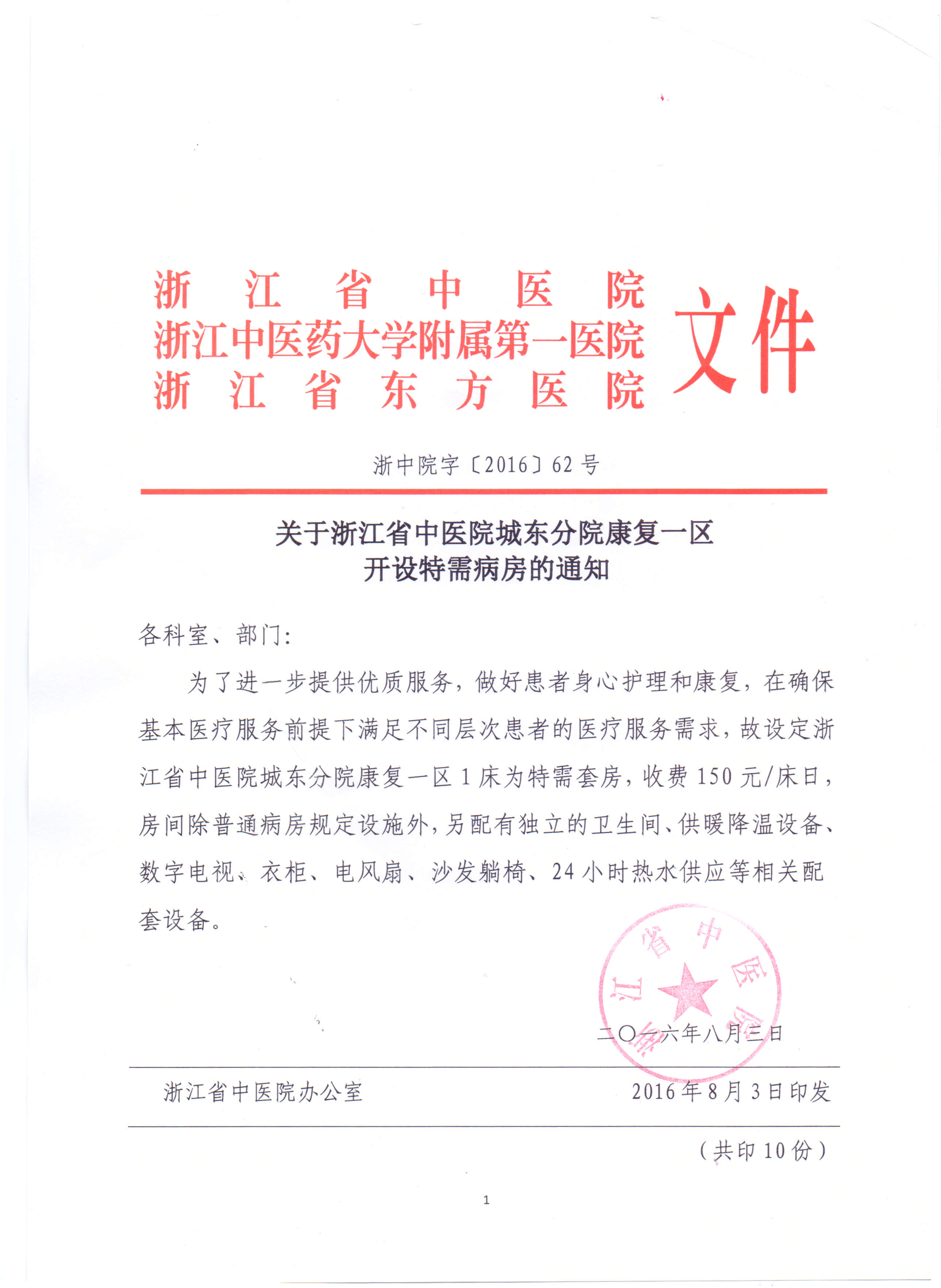 关于浙江省中医院城东分院康复一区开设特需病房的通知