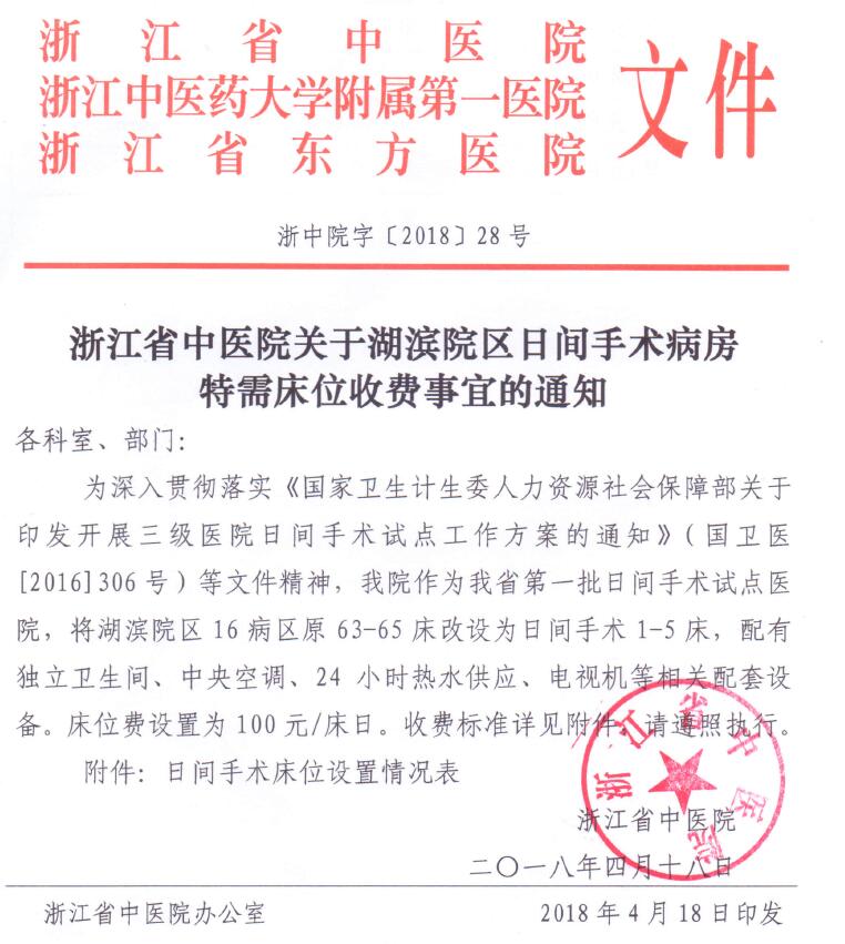 关于湖滨院区日间手术病房特需床位收费事宜的通知