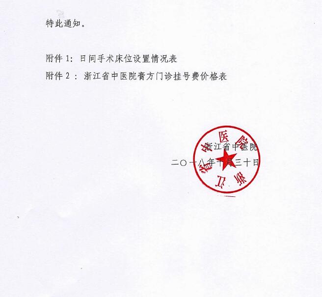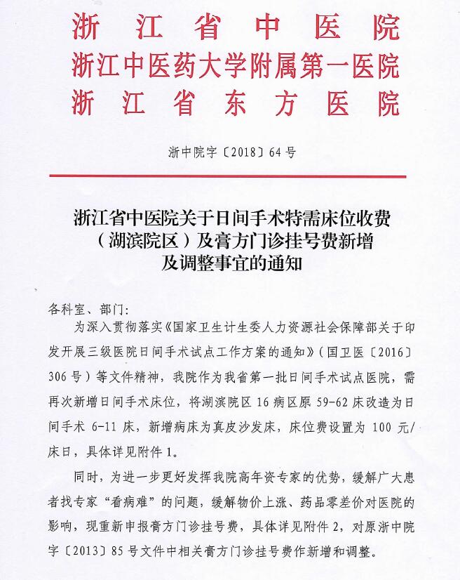 浙江省中医院关于日间手术特需床位收费(湖滨院区)及膏方节门诊挂号费新增及调整事宜的通