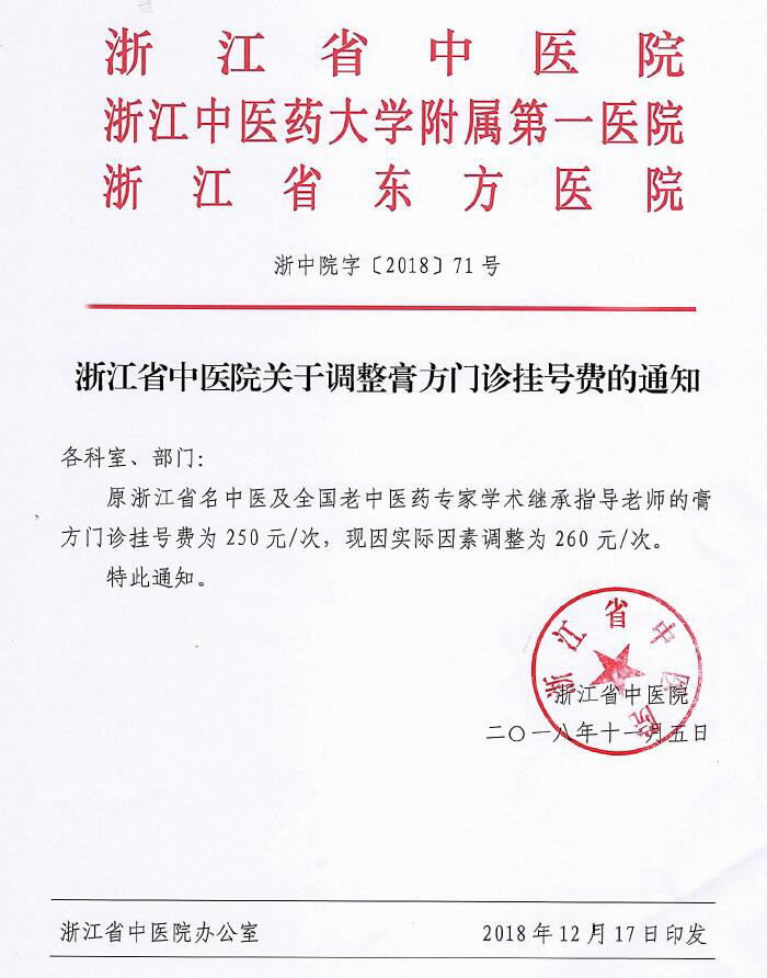 浙江省中医院关于调整膏方门诊挂号费的通知