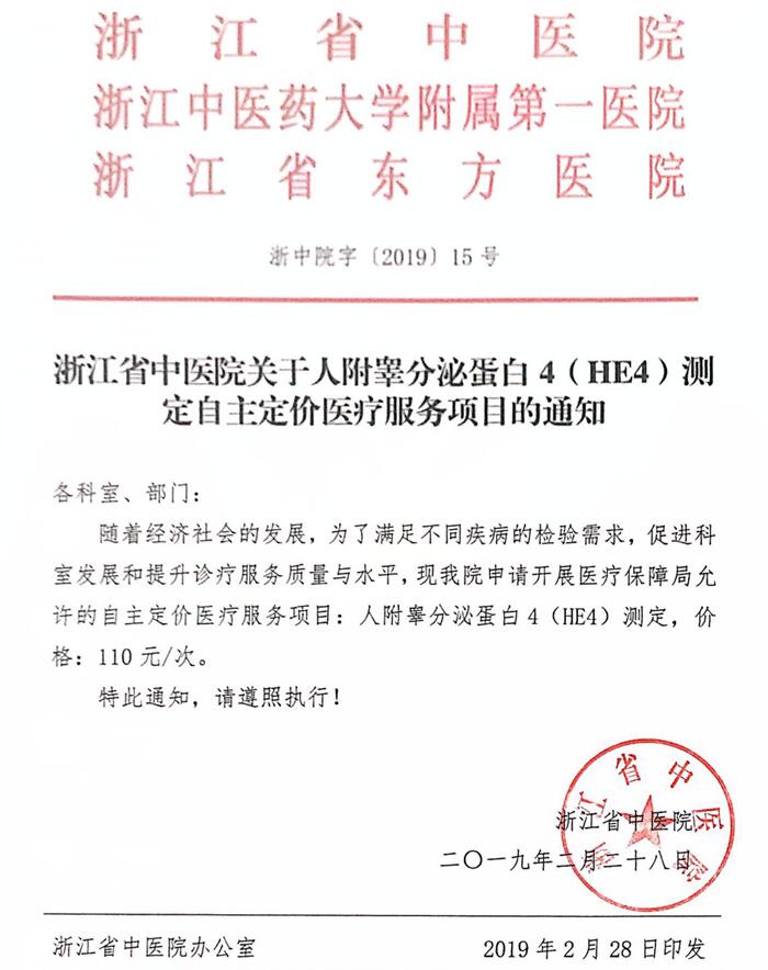 浙江省中医院关于人附睾分泌蛋白4(HE4)测定自主定价医疗服务项目的通知
