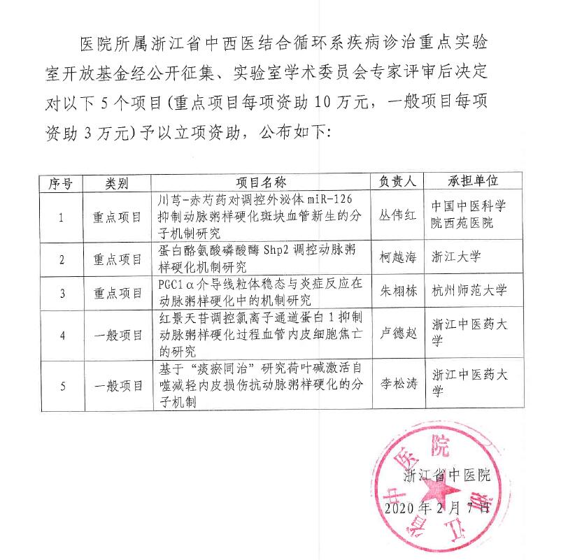 关于公布浙江省中医院省重点实验室开放基金立项结果的通知