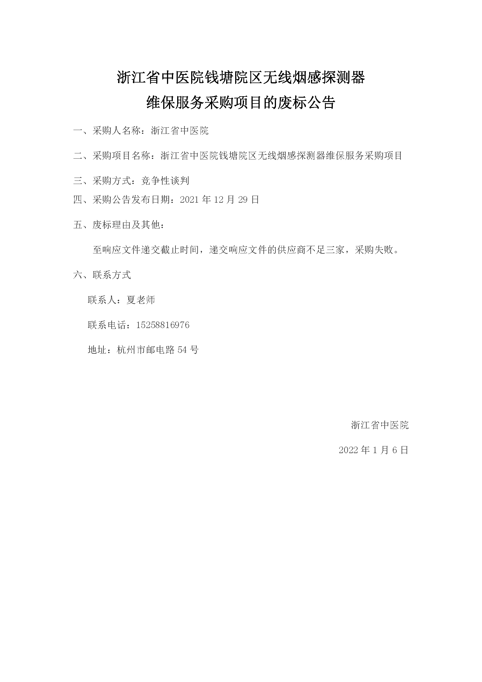 浙江省中医院钱塘院区无线烟感探测器维保服务采购项目的废标公告