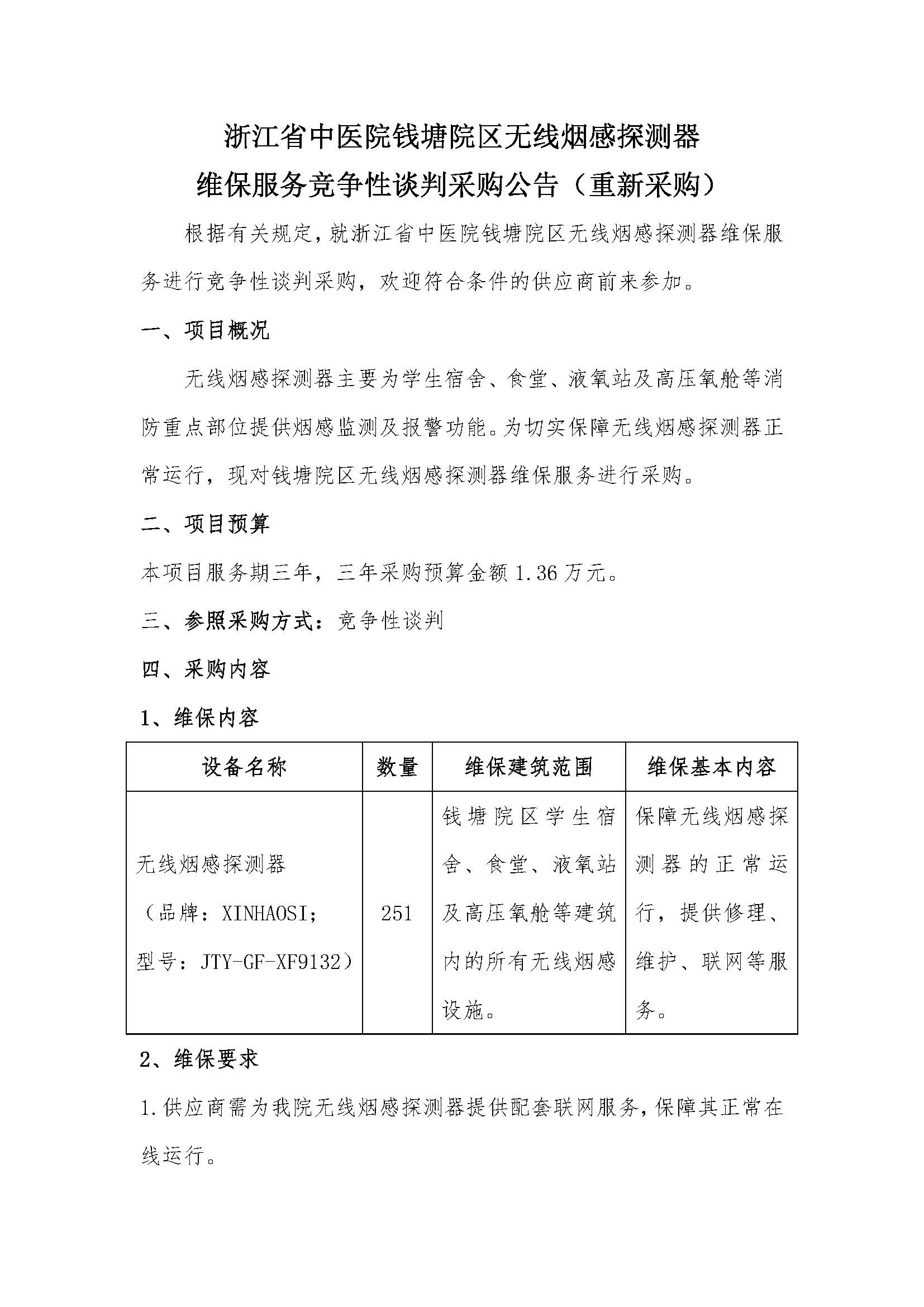 浙江省中医院钱塘院区无线烟感探测器维保服务竞争性谈判采购公告(重新采购)