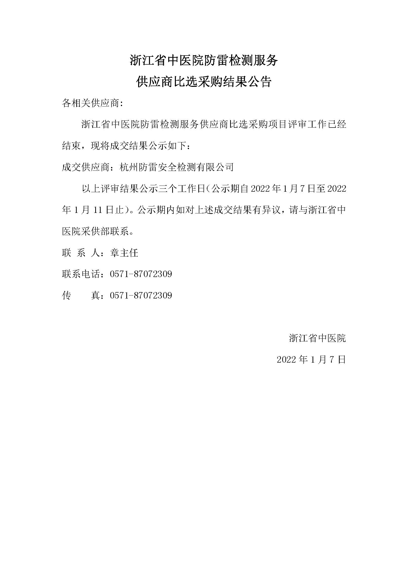 浙江省中医院防雷检测服务供应商比选采购结果公告
